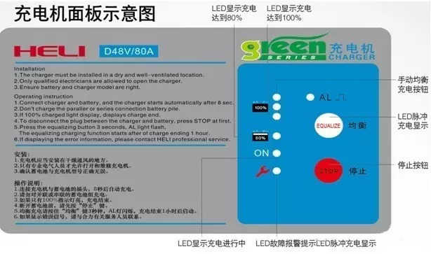 1.充電時一定要先連接車體的插頭再連接電源插座,充電機輸出插頭與蓄電池插頭相連接,務(wù)必連接到位,充電機開始自檢8秒后自動啟動充電功能,若無故障,則顯示充電進行中,若有故障,則有報警提示;