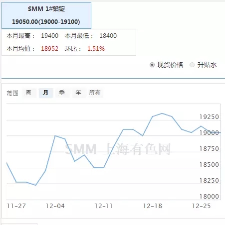 近期整體宏觀數(shù)據(jù)整體較好,金屬市場整體表現(xiàn)較強,近期鉛價突破19500元/噸一線,隨后呈現(xiàn)沖高回落態(tài)勢。近期鉛價走高主要受到河南環(huán)保限產(chǎn),安徽地區(qū)限氣影響。雖然受到環(huán)保限產(chǎn)等影響,供應趨緊,但是下游需求疲軟態(tài)勢并無改變,加上年底資金緊張,市場交投清淡,鉛價或?qū)⒕S持區(qū)間弱勢震蕩,據(jù)SMM預測將在18700元/噸-19300元/噸內(nèi)震蕩運行。